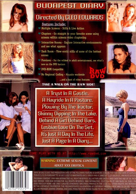 BUDAPEST DIARY Vivid Raw All Sex, Straight Starring: Olga E., Eva Black, Raggi & Barret Moore, Bobby Vitale, July and Cindy J., Eva Blondie, Nick East, Katy, David Perry, David Lau. Directed By: Cleo Edwards (Cleo Deniro in credits) Running Time: Feature:84 minutes Total: 202 minutes Rating: 8/10 FEATURE: This is an all sex feature devoid of any plot, all scenes are said to be shot in Budapest except the final scene. This is the third porn I have reviewed and one of the first I... |
